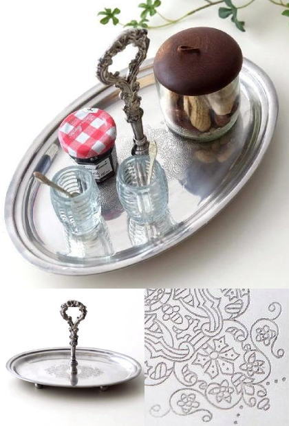 デコラティブな持ち手やトレイのエレガントな模様が印象的な