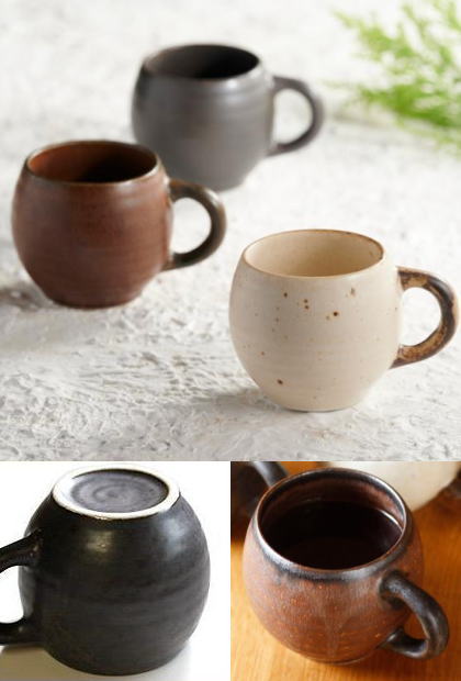 コロンとした丸いデザインの土物風マグカップ。