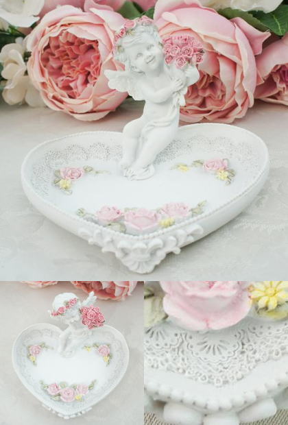 ハート型フレームにレースやバラに囲まれた可愛い天使の写真立て。